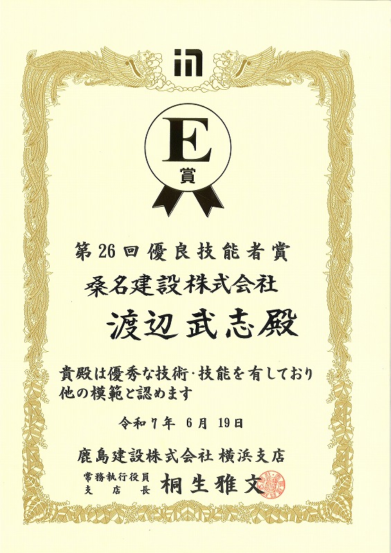 新東名高速道路河内川橋工事 において元請け企業の鹿島建設株式会社から、弊社の従業員が「優良技能者賞」の表彰状をいただきました。